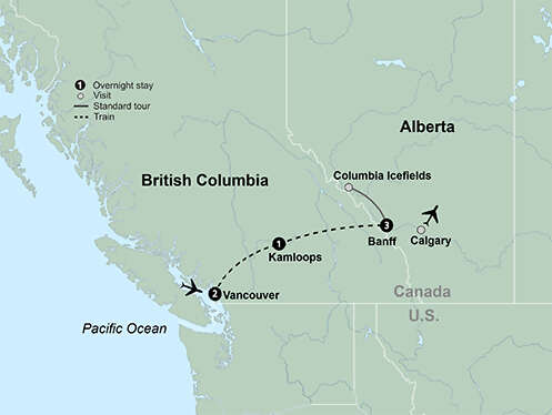 Set out to explore the best of Western Canada on a tour that opens in Vancouver and takes you to Banff aboard the famous Rocky Mountaineer train. Begin your trip with breakfast at Capilano Suspension Bridge. Enjoy the “living forest” and try their new Cliffwalk and Treetop Adventures. Then enjoy a sightseeing tour of Vancouver that begins in beautiful Stanley Park and stops in the famed Granville Market. Board your train and travel among the fields of Fraser Valley and the scenic Fraser River. Journey alongside Kicking Horse River while enjoying the beautiful scenery. During your time in Banff, stop at stunning Peyto Lake and admire Bow Falls.