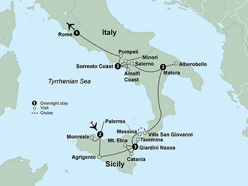 This journey will take you through a crossroads of civilizations in Sicily and on to the spectacular coastlines of Southern Italy. Begin your travels in Sicily. Uncover its Moorish and Norman influences that intertwine with Greek and Roman ruins standing guard over the landscape. Explore Agrigento’s ancient Valley of the Temples. Travel to the historic hilltop town of Taormina. Continue on to fascinating Southern Italy. Make a stop at a local winery for an agriturismo experience complete with wine tasting and a dinner featuring regional specialties. Explore the ancient town of “Sassi di Matera,” known for its cave dwellings. Spend time in the mystical town of Alberobello with its unusual cone-shaped roofed homes known as “trulli.” Discover spectacular Mt. Etna Volcano National Park. Explore the stunning Amalfi Coast and Sorrento. In evocative Pompeii, walk in the footsteps of ancient Romans who perished in the foothills of Mount Vesuvius.