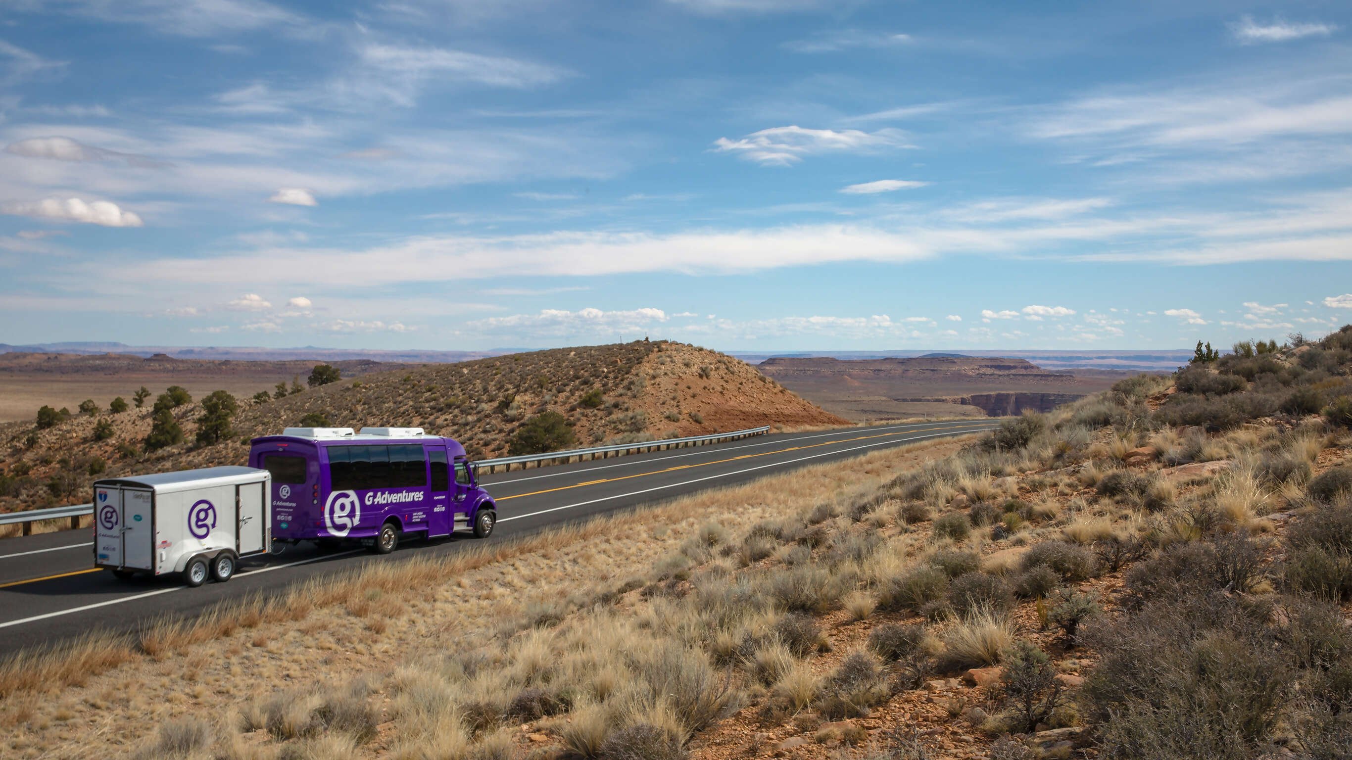 We use 25-passenger vehicles perfect for cross-country road trips on our 18-to-Thirtysomethings tours in the United States. Our new fleet of more cushy vehicles give travellers all the comfort of a big coach bus, but with a small-group experience. They put rider wellbeing first and foremost, with high-backed bucket seats and built-in headrests for all seats on board, huge 92cm-tall (36 in) windows that make every seat a window seat, an aisle way with enough headroom for most of stand upright, sliding seats that free up more shoulder room while on the road, A/C, charging stations, wi-fi, and loads of other features. We use a trailer to carry luggage and camping equipment. These are durable vehicles that allow us to drive on most types of roads in North America.