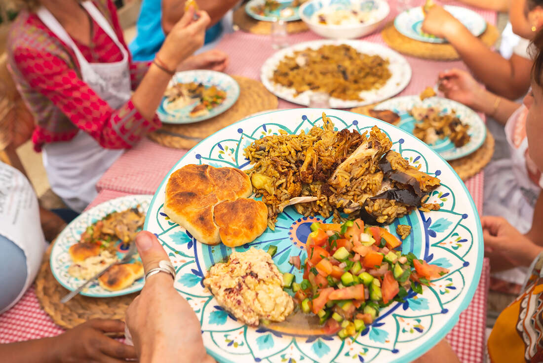 Savour the smells and tastes of a freshly prepared Bedouin zarb – slow roasted vegetables and juicy spiced meats cooked to perfection in an underground barbecue.
